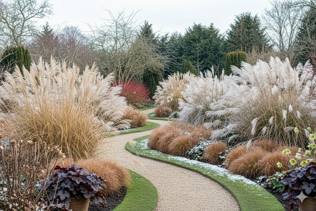 - 그라스(Grass)류: 수크령이나 억새는 겨울에도 갈색 톤의 질감을 유지하며 바람에 흔들리는 소리를 선사합니다.