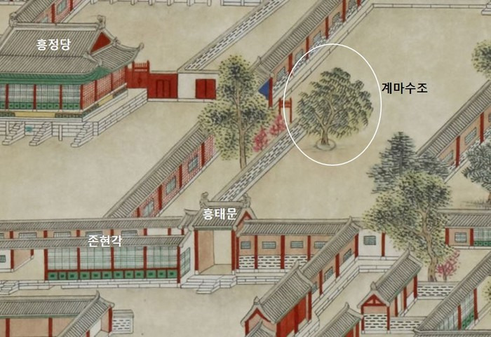 정조는 세손 시절 거처하던 존현각 안마당(흥태문 인근)에 이 나무가 있었기에 누구보다 계마수조를 가까이서 지켜보았습니다. 자신이 지은 《서궐도》에도 이 나무의 위치와 내력을 상세히 기록할 정도였죠.