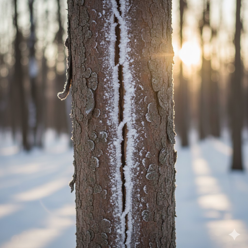 이를 '피소(볕데임, Sunscald)' 또는 '상렬(서리 갈라짐, Frost crack)'이라고 부릅니다. 과일나무 줄기에 흰색 수성 페인트를 칠하거나 흰색 플라스틱 튜브를 감싸주는 이유는, 바로 이 빛 반사율을 높여 나무가 겨울잠에서 너무 일찍 깨지 않도록 보호하기 위함입니다.