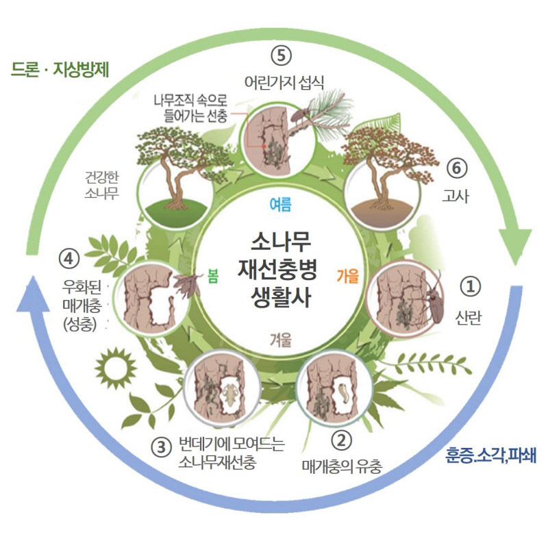 - 물기둥 단절: 괴사한 세포에서 흘러나온 내용물들이 가도관 내 물기둥의 연속성을 파괴합니다. 결과적으로 수분과 양분의 상승이 생리적으로 완전히 차단되면서 나무는 급격히 시들어 죽게 되는 것입니다.