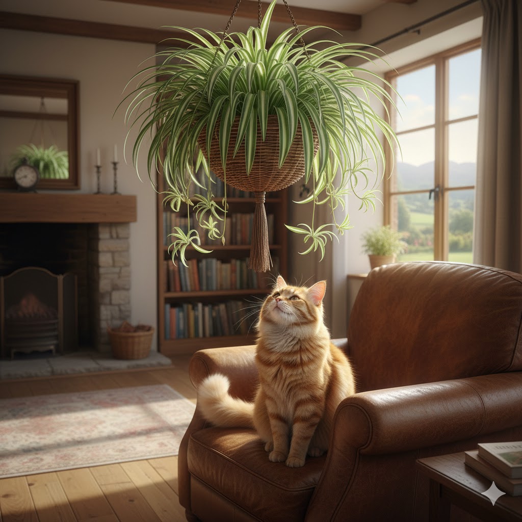 - 거미식물(접란) 거미식물은 고양이에게 약간의 환각 효과(캣닙과 유사한 반응)를 주기도 하지만 독성이 없어 안전합니다. 또한 일산화탄소 제거 능력이 탁월해 실내 공기를 깨끗하게 유지함으로써 반려동물의 호흡기 건강에도 도움을 줍니다.